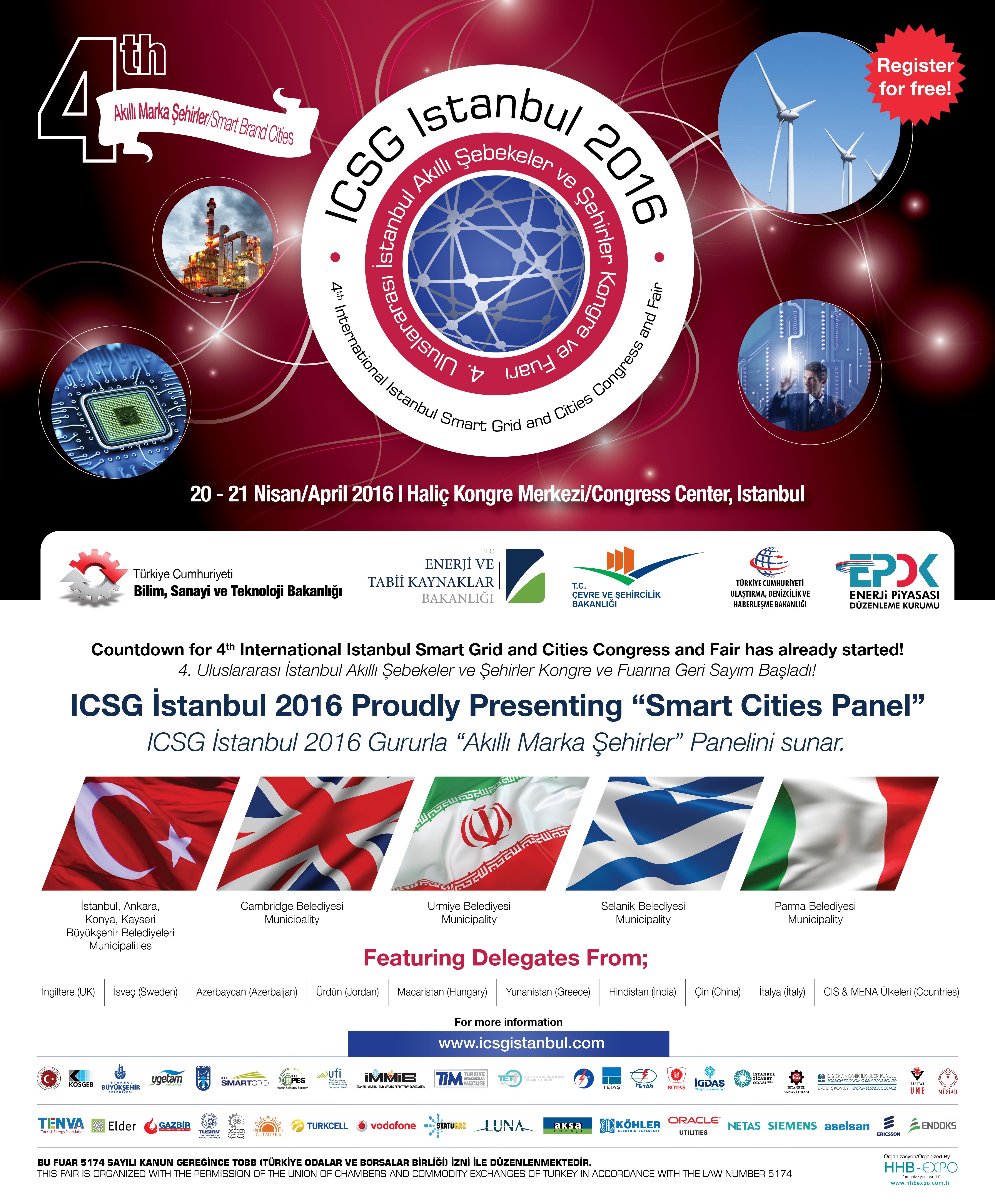 T.C. Bilim, Sanayi ve Teknoloji Bakanlığı, T.C. Enerji ve Tabii Kaynaklar Bakanlığı, T.C. Çevre ve Şehircilik Bakanlığı ve UGETAM’ın himayelerin de düzenlenecek olan “4. Uluslararası İstanbul Akıllı Şebekeler ve Şehirler Kongre ve Fuarı” 20-21 Nisan 2016 tarihlerinde, İstanbul Haliç Kongre Merkezi’nde HHB Expo Fuar şirketi tarafından gerçekleştirilecektir.