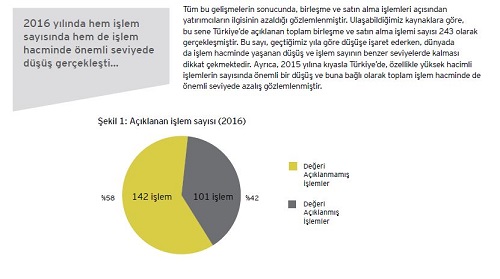 EY Kurumsal Finansman Bölümü, her yıl hazırladığı ve bu yıl 15.’sini yayınladığı Birleşme ve Satın Alma İşlemleri 2016 Raporu’nu açıkladı. Rapora göre, tüm dünyada birleşme ve satın alma aktivitesinde işlem hacminde düşüş yaşanırken, küresel işlem sayısı 2015’e paralel bir seyir izledi. Türkiye’de ise işlem sayısında ve hacminde önemli seviyede düşüş gerçekleşti.