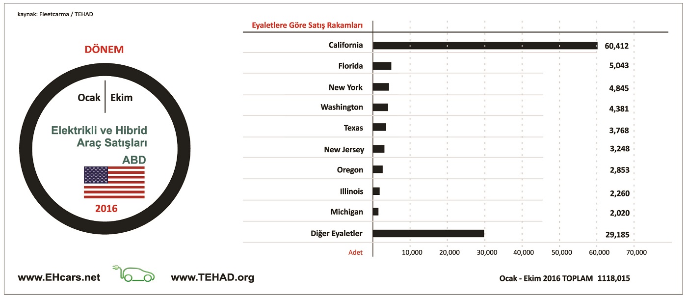 Dünya Elektrikli Otomobil pazarını domine eden 2 ülkeden biri olan ABD’de geçtiğimiz 2016 yılında toplam 159333 adet Elektrikli Otomobil satıldı.