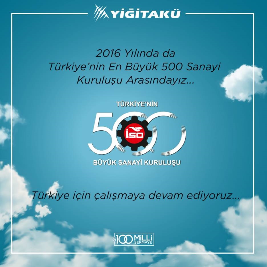 Türkiye’nin 500 Büyük Sanayi Kuruluşu (İSO 500) arasında 2016 yılındaki genel başarı sıralamasını bir önceki yıla göre 59 basamak, ihracattaki başarı sıralamasını ise; 80 basamak daha üst seviyeye çıkartan Yiğit Akü, 2016 yılında İSO 500 genel sıralamalarında 369. sırada, ihracatta ise 159. sırada yerini alarak, bu yıl da başarıları ile adından söz ettiriyor.