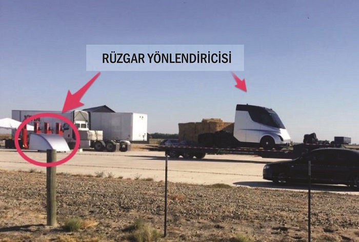 Tesla kamyonun casus fotoğraflarından anlaşıldığı kadarıyla daha önce yayınlanan teaser görüntüleri ile neredeyse aynı tasarım özelliklerine sahip. Benzersiz ön far grubu, şişkin çamurluklar ve sürücü kabini ile ön tasarım detaylarına bağlı kalınmış. Fotoğraflardan görüldüğü üzere, Elektrikli Kamyonun rüzgar direnci üzerine testler gerçekleştiriliyor. Maksimum enerji verimliliğinden faydalanabilmek amacıyla, kamyonun sürücü kabini ile arkasındaki römorkun ortaya çıkartacağı rüzgar direnci hesaplanıyor. Tam dolu şarj ile yaklaşık 320 ile 480km menzile sahip olacağı belirtilen Tesla Elektrikli Kamyon için, rüzgar direncinin ne kadar önemli olduğu çok net. Üstteki fotoğrafta rüzgar yönlendiricinin araç üzerinden çıkartılmış olduğu görülüyor.