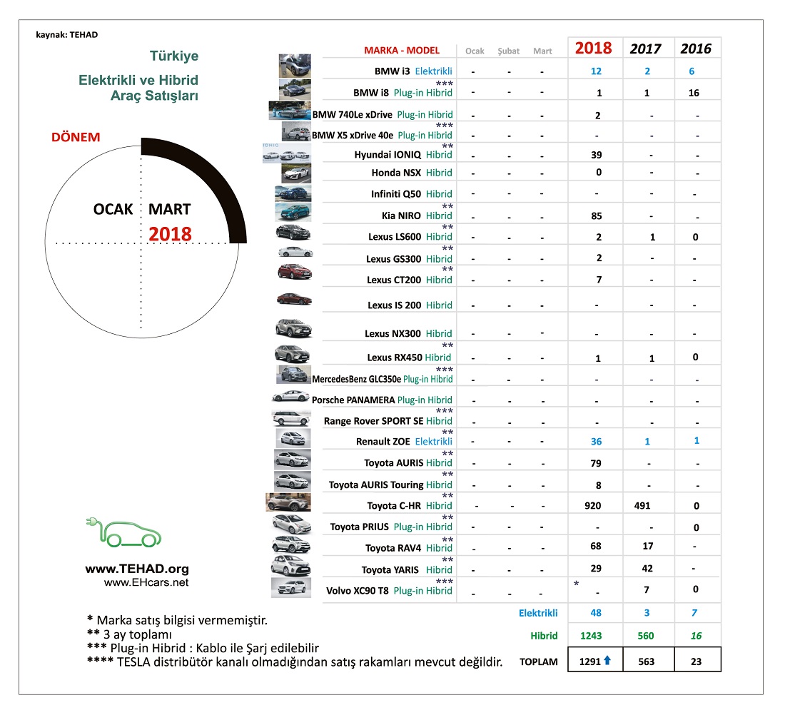 2018 yılının ilk çeyreğinde Türkiye’de satılan Elektrikli ve Hibrid Otomobil marka ve modellerine ilişkin son rakamlar, TEHAD tarafından açıklandı. Türkiye Elektrikli ve Hibrid Araçlar Platformu (TEHAD) verilerine göre, bu yılın Ocak-Mart aylarında gerçekleşen 1295 adetlik otomobil satışlarının 48 adetlik bölümünü %100 elektrikli modeller oluştururken, hibrid motor seçeneğine sahip modellerin satış adeti 1243 olarak gerçekleşti. Bir önceki yılın aynı dönemine göre 2,5 katına denk gelen satış rakamına ulaşıldı.