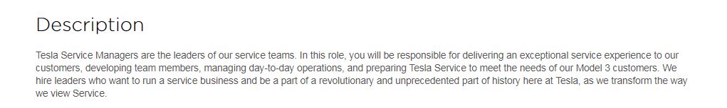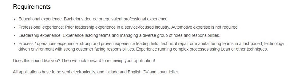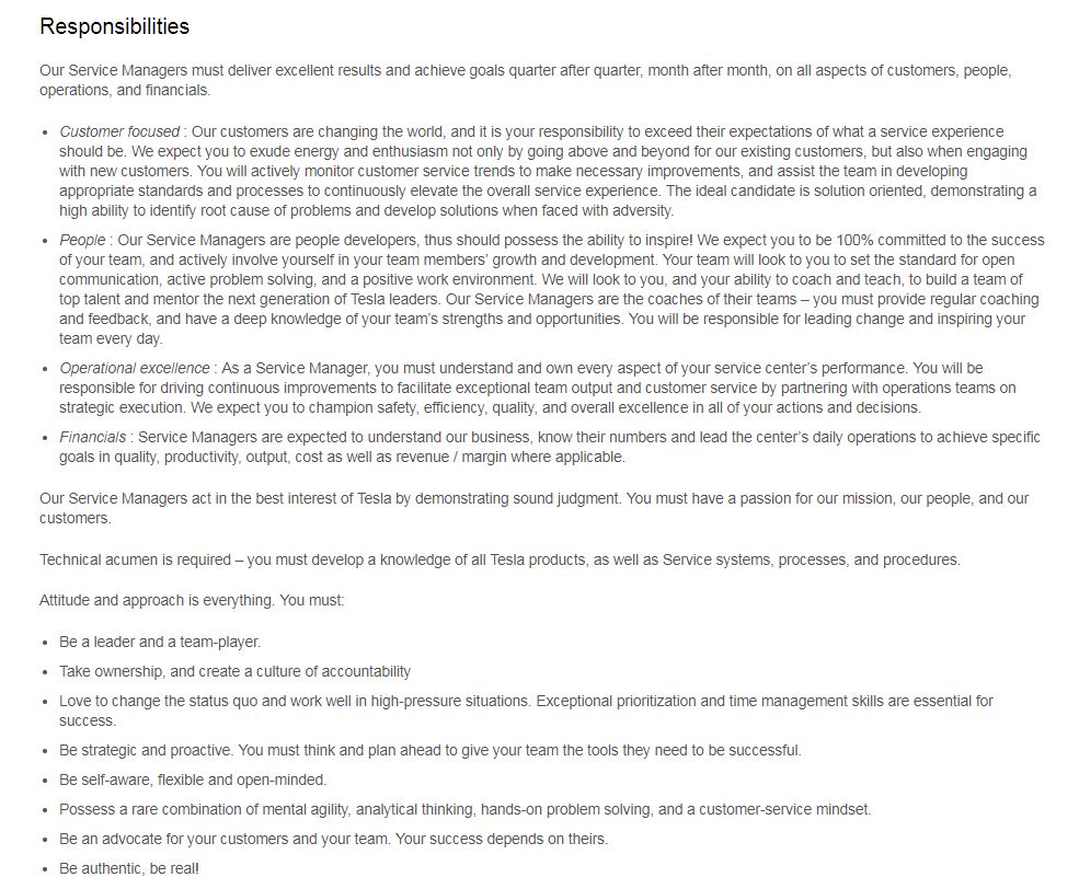İlana başvuru şartları olarak; Lisans derecesi veya buna denk profesyonel deneyime sahip olmak gerekiyor. Görev tanımında ise “müşterilere mükemmel bir servis deneyimi sunmak, takım üyelerini geliştirmek, günlük operasyonları yönetmek ve Tesla servisini Model 3 müşterilerinin ihtiyaçlarına hazır hale getirmek” olarak belirtilmiş.
