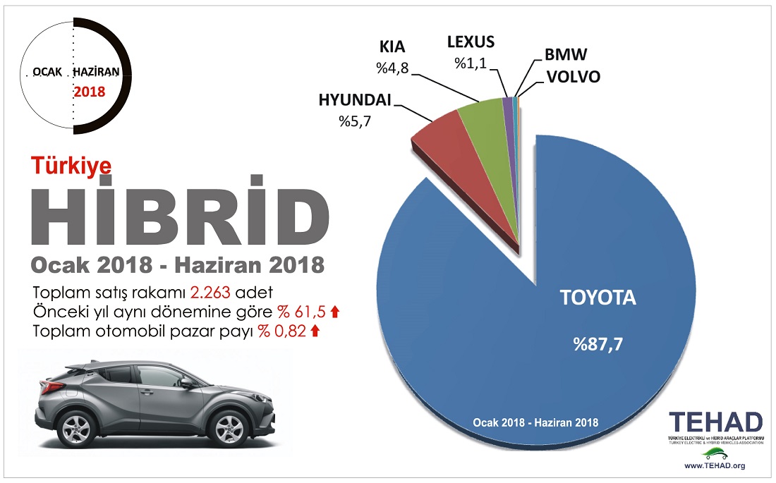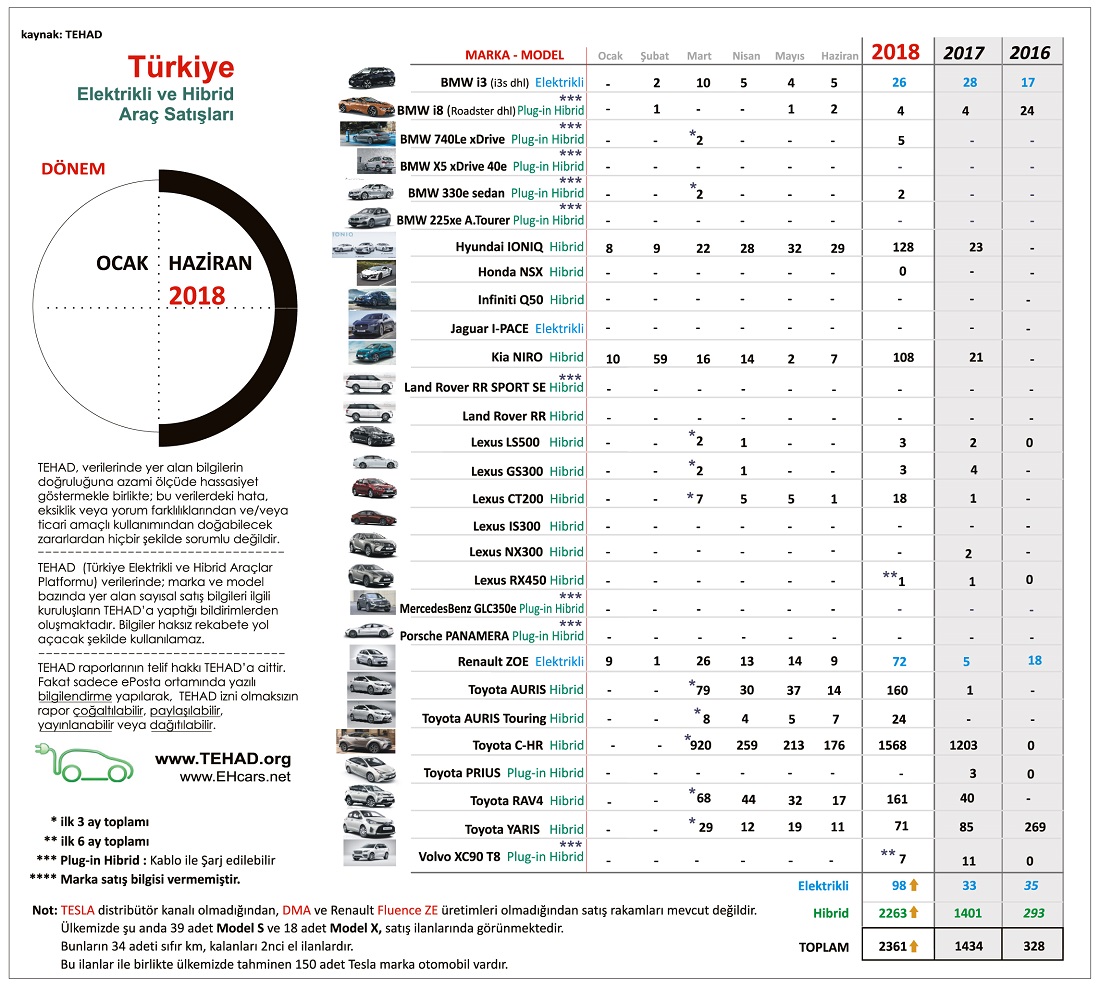 2018 yılının ilk yarısında Türkiye’de satılan Elektrikli ve Hibrid Otomobil marka ve modellerine ilişkin son rakamlar, TEHAD tarafından açıklandı. Türkiye Elektrikli ve Hibrid Araçlar Platformu (TEHAD) verilerine göre, bu yılın Ocak-Haziran aylarında gerçekleşen 2361 adetlik otomobil satışlarının 98 adetlik bölümünü %100 elektrikli modeller oluştururken, hibrid motor seçeneğine sahip modellerin satış adeti 2263 olarak gerçekleşti.