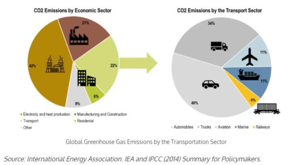 Şimdi buraya küçük bir es vererek yukarıda neden “emisyon probleminin bir kısmını” dediğimi açıklamak istiyorum. Aşağıdaki grafik dünyadaki emisyon salımını sektörlerine göre sınıflandırmış, sağdaki ise ulaşım sektöründeki emisyon katkısını araç tiplerine göre ayırmış. Grafiklerden anlayacağınız üzere karayolu ulaşımı toplam emisyon salımının yaklaşık sadece %15’in oluşturuyor: