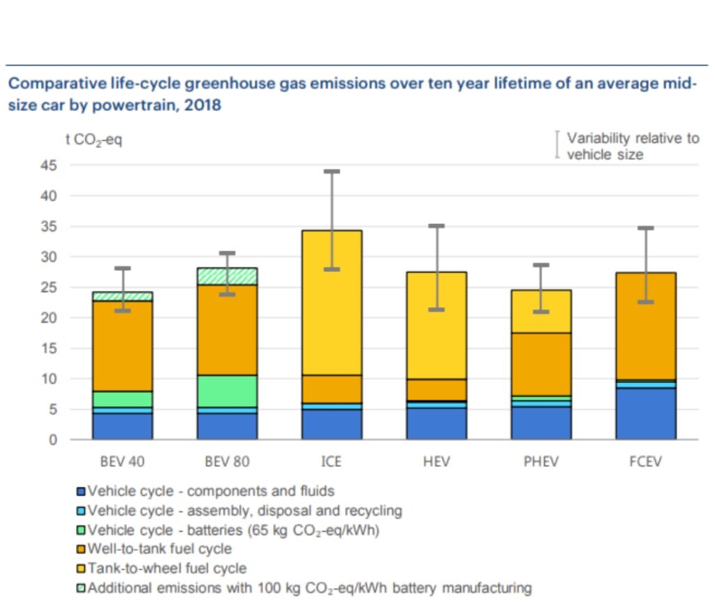 - Grafik en soldan başlayarak 40 kWh bataryaya sahip elektrikli araç, 80 kWh bataryaya sahip elektrikli araç, İçten yanmalı motorlu araç (ICE), Hibrit elektrikli araç (HEV), Plug-in Hibrit elektrikli araç, yakıt hücreli hidrojen ile çalışan elektrikli araç (FCEV) olarak sıralanmıştır.