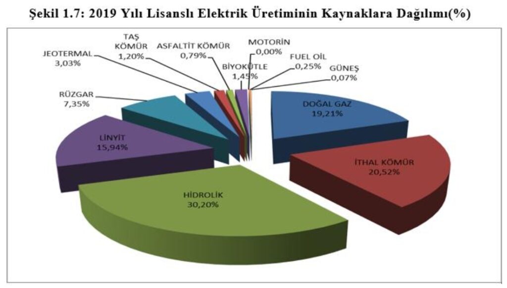 Son olarak EPDK raporuna göre Türkiye’nin 2019 yılı elektrik üretiminin kaynaklara göre dağılımını verelim: