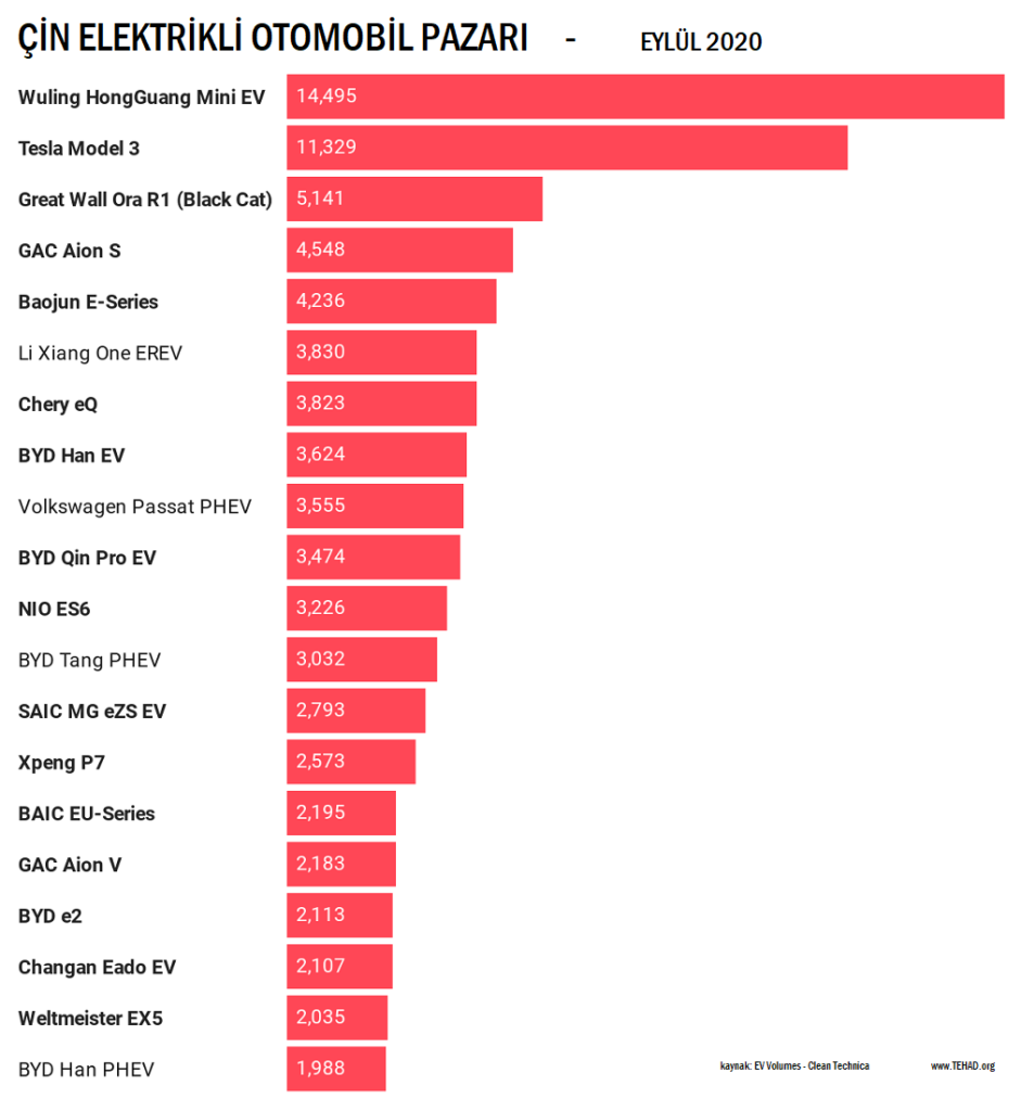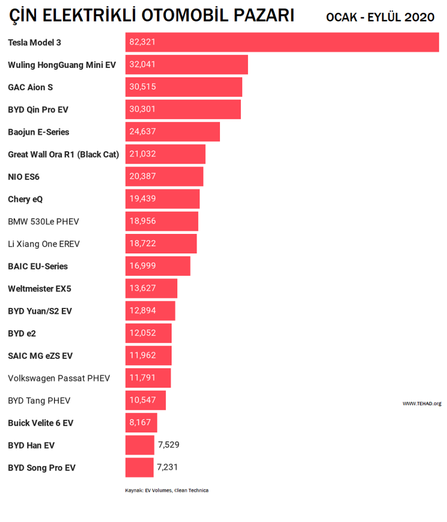 Yıllık bazda ise Tesla Model 3 açık ara fark atmış durumda. Ocak – Eylül 2020 tarihleri arasında toplam satış rakamı 82,321 adete ulaştı. Wuling ise 32,041 adet ile ikinci sırada yer aldı. Çin pazarında %100 elektrikli modeller geçen yıla göre % 73 oranında artış göstermiş durumda. PHEV modellerin ise bu dönemdeki artış hızı % 43’te kaldı. Aylık bazda ise tüm segment aralığı geçtiğimiz yılın Eylül ayına göre % 8 artış gösterdi.