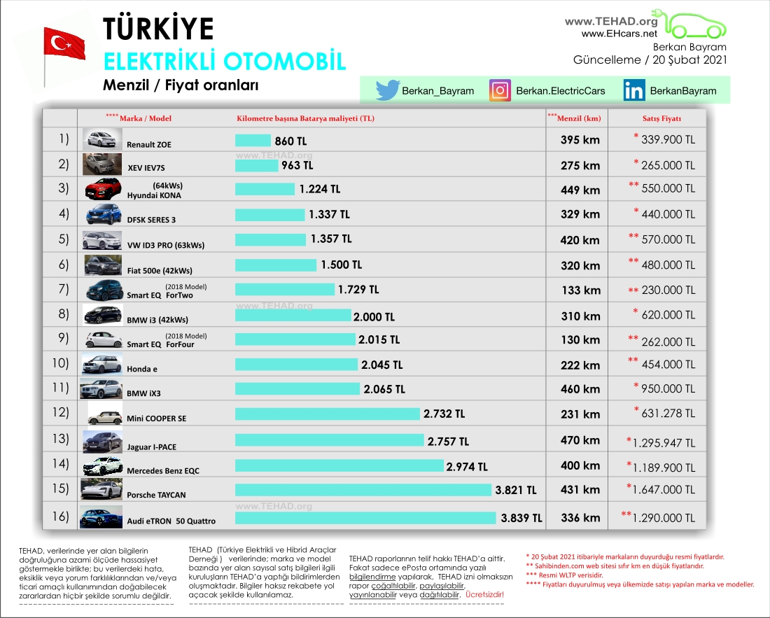 1 Şubat 2021 tarihi itibariyle Elektrikli Otomobilde ÖTV oranlarına %300’leri aşan zam geldi. Türkiye elektrikli otomobil satış listesine 2011 yılında ilk kez Renault Fluence ZE modeli giriş yapmıştı. 2015 yılına geldiğimizde, pazara BMW i3 ve Renault Zoe modelleri de katıldı. Bugün geldiğimiz durumda Türkiye pazarı, paralel ithalat yöntemi ile getirilen modeller dahil, 16 farklı elektrikli model ile temsil ediliyor. Peki fiyat / menzil oranı bakımından, verdiğimiz ücretin karşılığında ne kadar menzil alıyoruz?