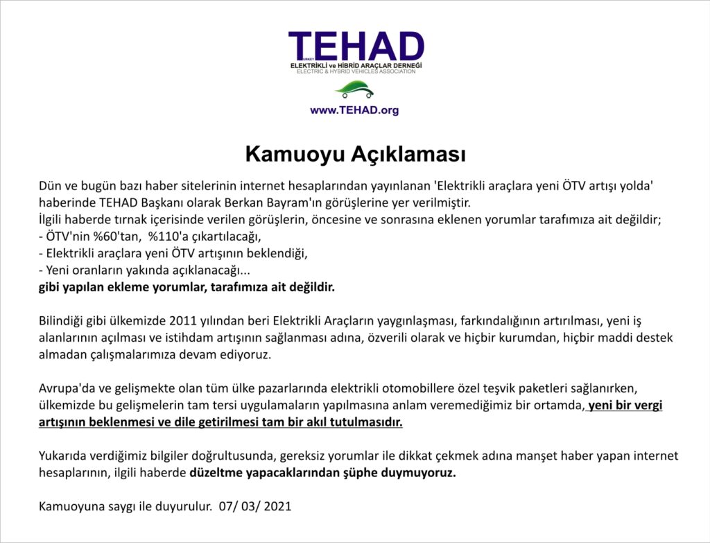 Dün ve bugün bazı haber sitelerinin internet hesaplarından yayınlanan ‘Elektrikli araçlara yeni ÖTV artışı yolda’ haberinde TEHAD Başkanı olarak Berkan Bayram’ın görüşlerine yer verilmiştir. İlgili haberde tırnak içerisinde verilen görüşlerin, öncesine ve sonrasına eklenen yorumlar tarafımıza ait değildir;