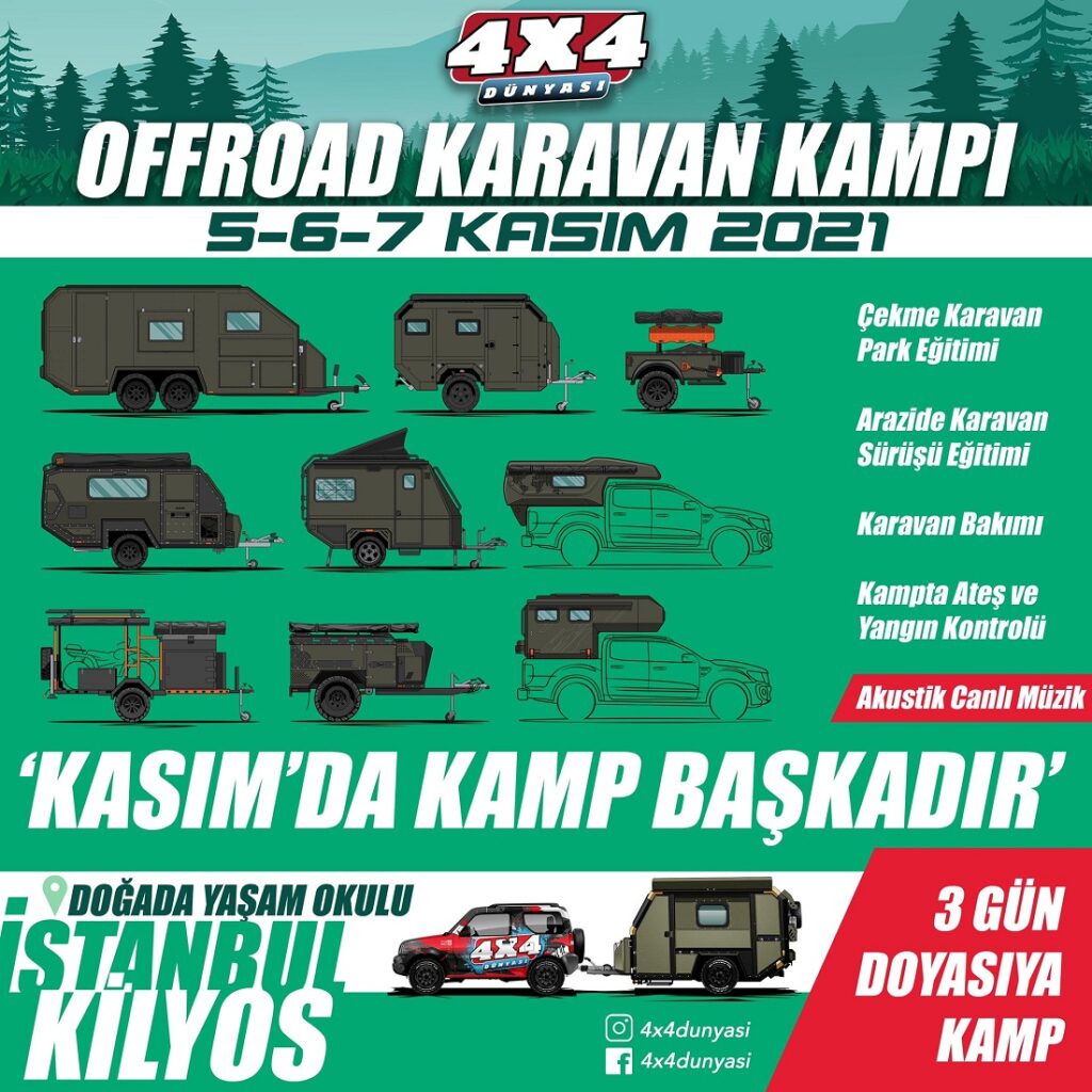 Bu hafta sonu düzenlenen “4×4 Dünyası Offroad Karavan Kampı”, asfalt ve gürültüyü geride bırakıp, doğa ve huzurla kucaklaşmak isteyen Offroad karavan sahiplerini, Kilyos Doğada Yaşam Okulu’nda bir araya getirecek. Doğa tutkunlarına Kasım ayında kamp keyfi sunan “4×4 Dünyası Offroad Karavan Kampı” etkinliği, Offroad karavan sahiplerine özel olarak düzenleniyor.