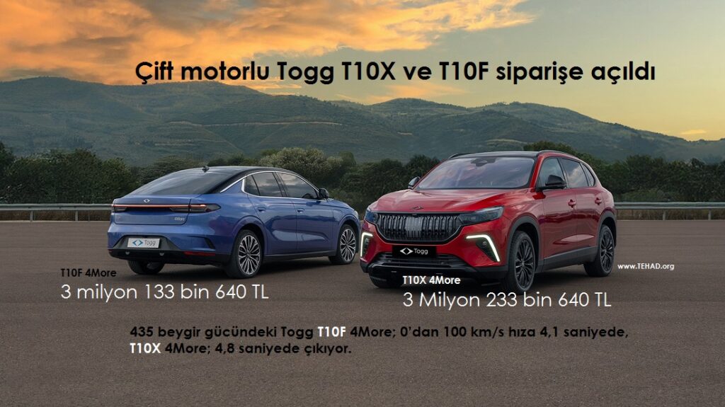 ‘Bir otomobilden fazlası için’ yola çıkan Togg, Euro NCAP’ten en yüksek seviye olan 5 yıldız alan T10X ve T10F cihazlarını, şimdi de güç, güvenlik, konfor ve tasarımı bir araya getiren 4More versiyonlarıyla yollara çıkarıyor. Togg’un dijital platformu Trumore üzerinden 7 Ekim’de siparişe açılan T10X 4More Obsidiyen ve T10F 4More, 435 beygir güç ve 700 Nm tork üreten çift motorlu yapısıyla üstün bir performans sunuyor. T10F 4More 0’dan 100 km/s hıza 4,1 saniyede, T10X 4More ise 4,8 saniyede çıkıyor. T10X 4More Obsidiyen 468 km’ye, T10F 4More ise 523 km’ye varan menziliyle dikkat çekiyor. Panoramik cam tavan ve Meridian ses sisteminin standart olarak sunulduğu T10X ve T10F 4More anahtar teslim fiyatları ise şöyle: