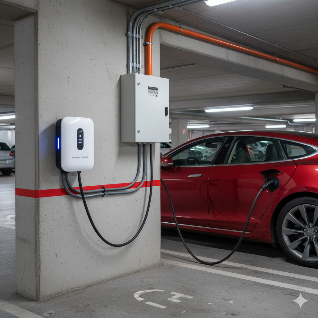 Kapalı otopark içerisinde duvar tipi 11kW güçte şarj ünitesi kurulumu